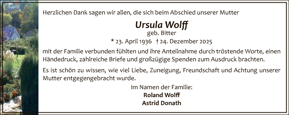 Hier finden Sie alle Traueranzeigen aus der Zeitung, die bisher für Ursula Wolff erschienen sind. Weitere Traueranzeigen, die in der Zeitung erscheinen, werden hier ebenfalls aufgelistet