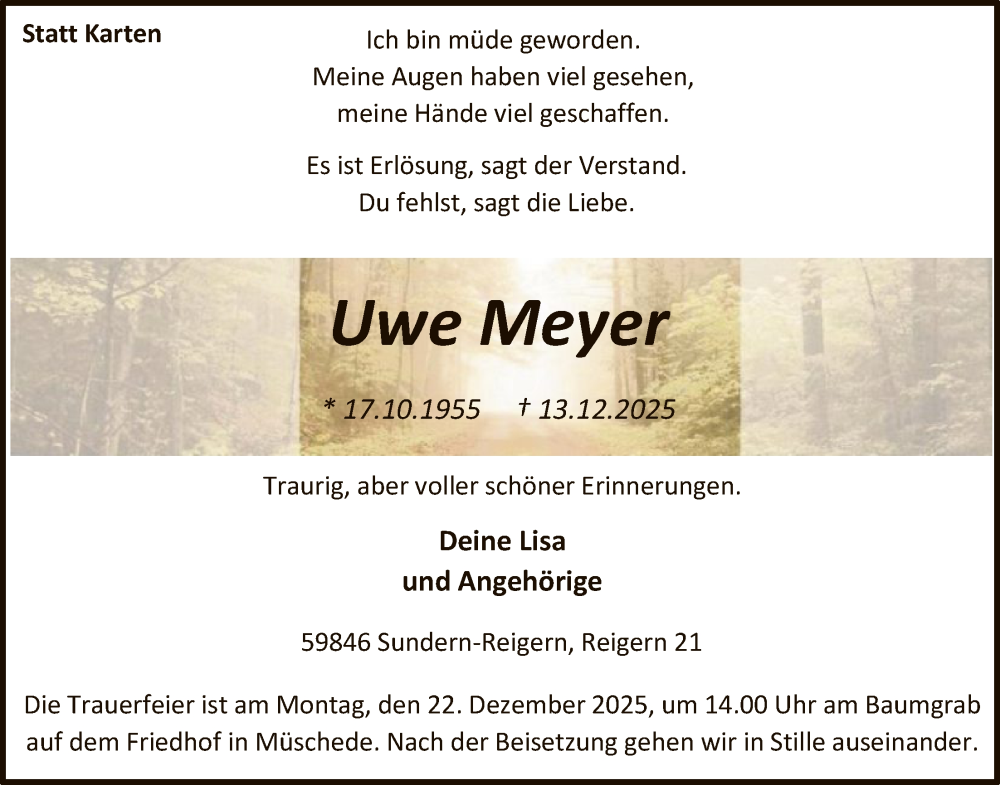 Hier finden Sie alle Traueranzeigen aus der Zeitung, die bisher für Uwe Meyer erschienen sind. Weitere Traueranzeigen, die in der Zeitung erscheinen, werden hier ebenfalls aufgelistet