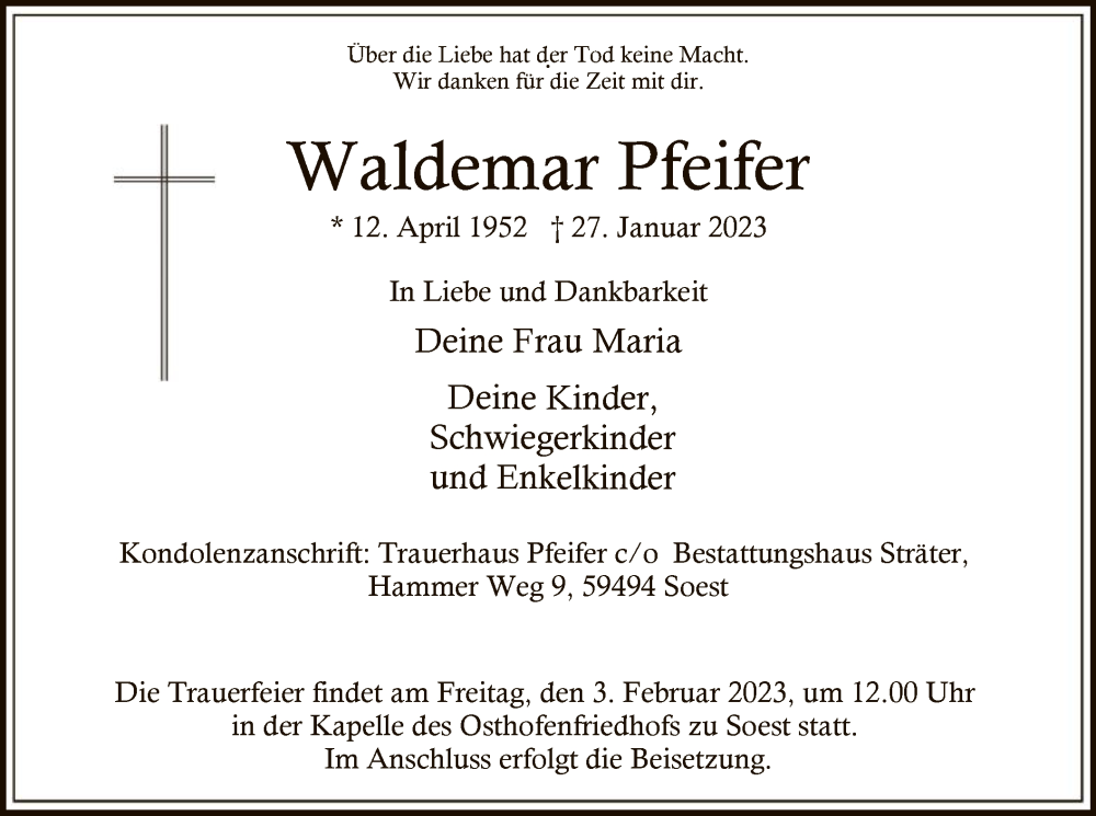 Hier finden Sie alle Traueranzeigen aus der Zeitung, die bisher für Waldemar Pfeifer erschienen sind. Weitere Traueranzeigen, die in der Zeitung erscheinen, werden hier ebenfalls aufgelistet