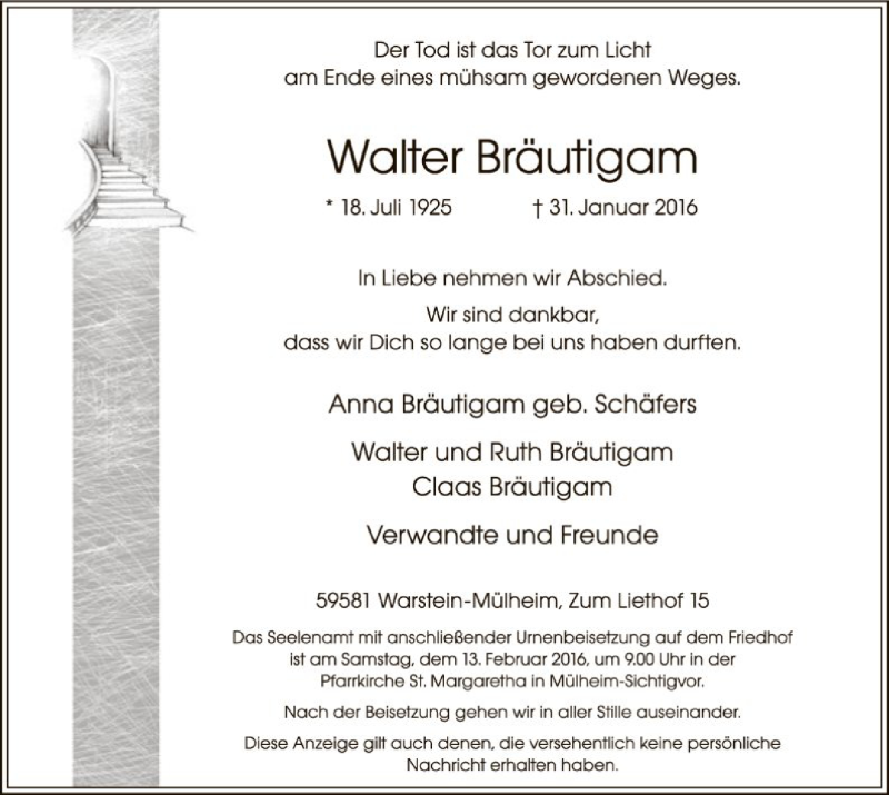 Hier finden Sie alle Traueranzeigen aus der Zeitung, die bisher für Walter Bräutigam erschienen sind. Weitere Traueranzeigen, die in der Zeitung erscheinen, werden hier ebenfalls aufgelistet