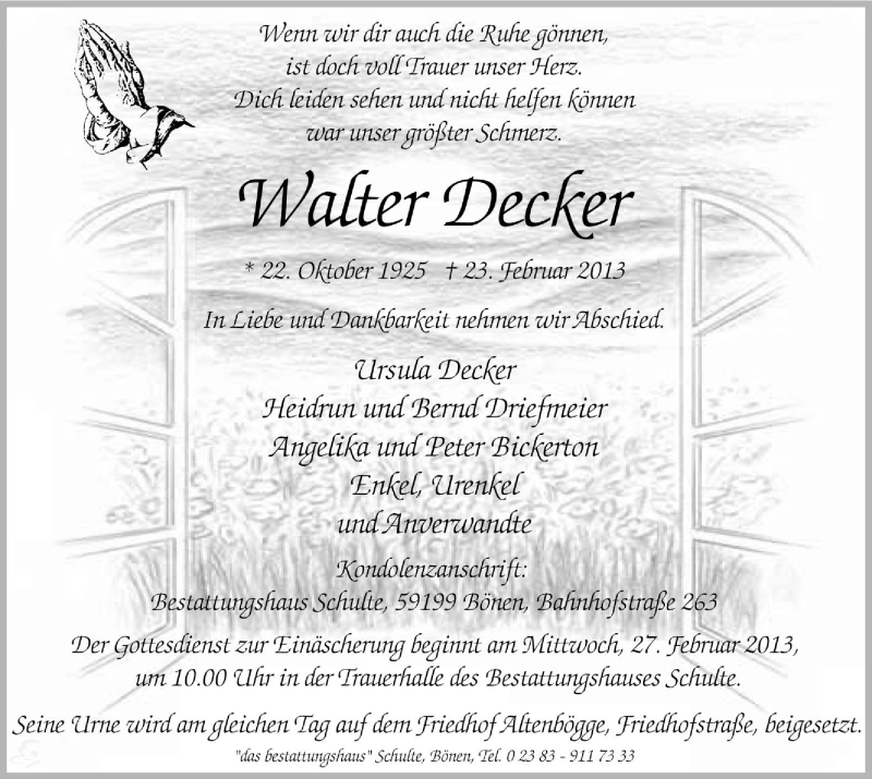 Hier finden Sie alle Traueranzeigen aus der Zeitung, die bisher für Walter Decker erschienen sind. Weitere Traueranzeigen, die in der Zeitung erscheinen, werden hier ebenfalls aufgelistet