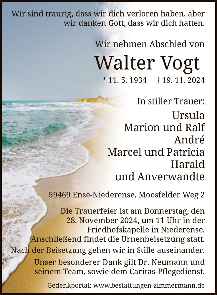Hier finden Sie alle Traueranzeigen aus der Zeitung, die bisher für Walter Vogt erschienen sind. Weitere Traueranzeigen, die in der Zeitung erscheinen, werden hier ebenfalls aufgelistet