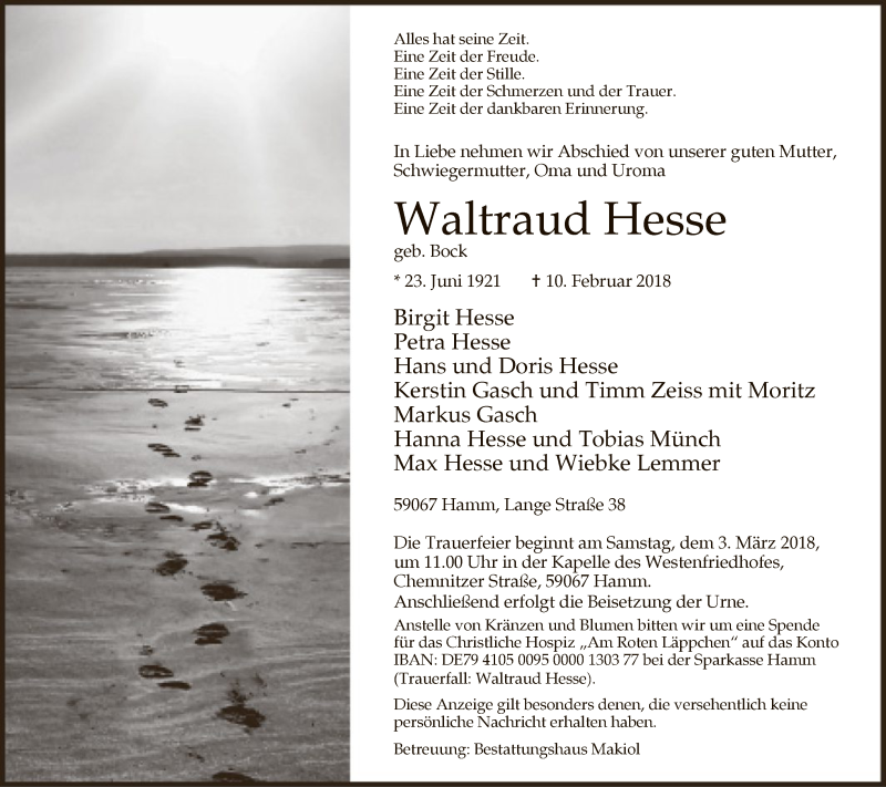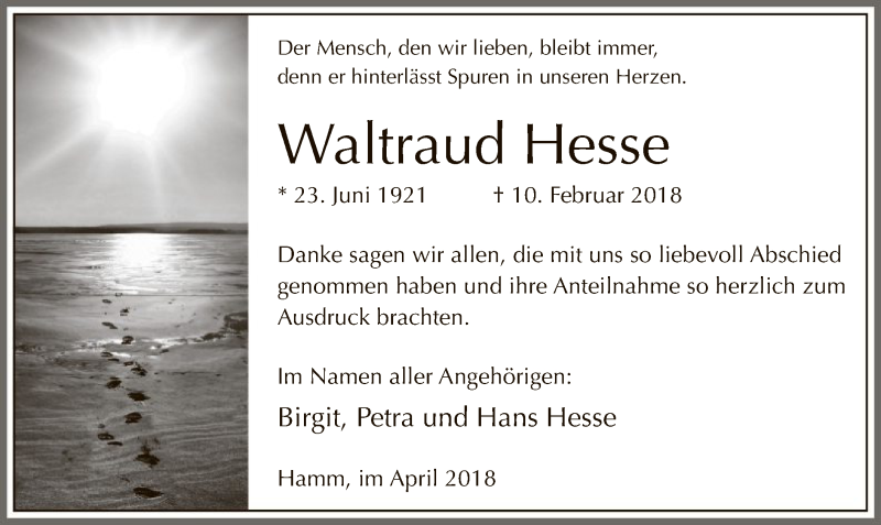 Hier finden Sie alle Traueranzeigen aus der Zeitung, die bisher für Waltraud Hesse erschienen sind. Weitere Traueranzeigen, die in der Zeitung erscheinen, werden hier ebenfalls aufgelistet