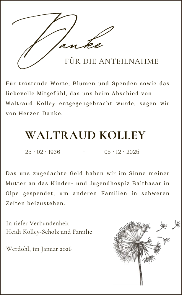 Hier finden Sie alle Traueranzeigen aus der Zeitung, die bisher für Waltraud Kolley erschienen sind. Weitere Traueranzeigen, die in der Zeitung erscheinen, werden hier ebenfalls aufgelistet