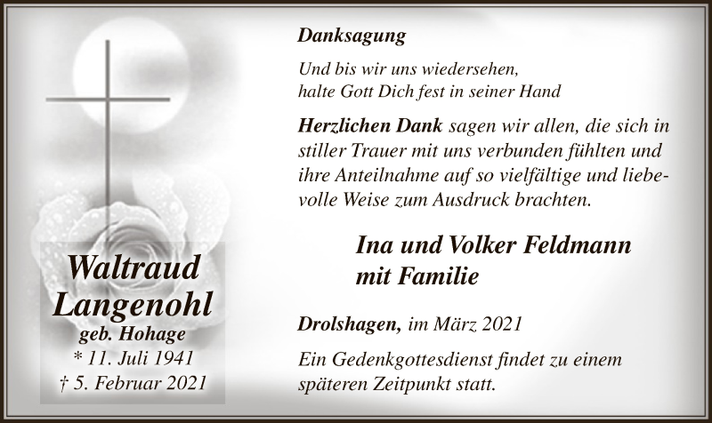 Hier finden Sie alle Traueranzeigen aus der Zeitung, die bisher für Waltraud Langenohl erschienen sind. Weitere Traueranzeigen, die in der Zeitung erscheinen, werden hier ebenfalls aufgelistet