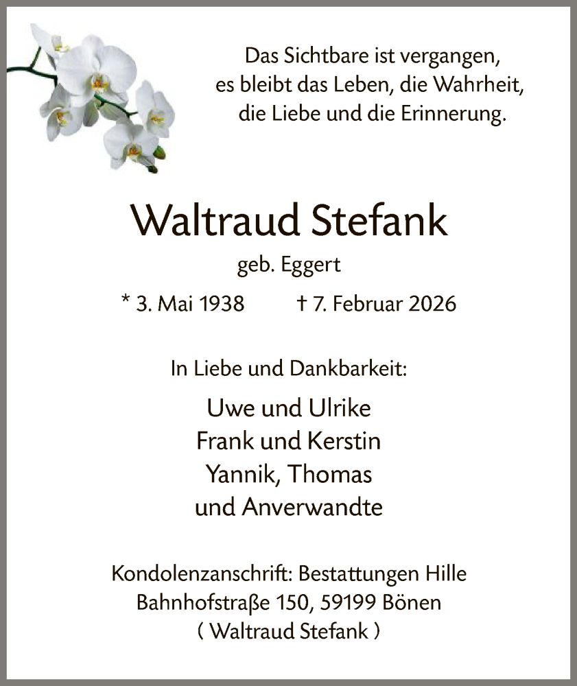 Hier finden Sie alle Traueranzeigen aus der Zeitung, die bisher für Waltraud Stefank erschienen sind. Weitere Traueranzeigen, die in der Zeitung erscheinen, werden hier ebenfalls aufgelistet