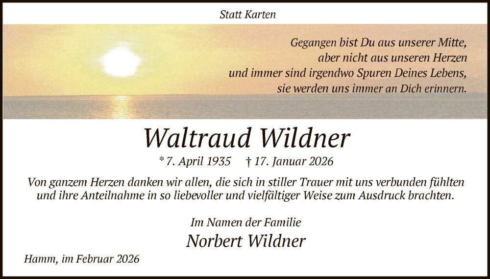 Hier finden Sie alle Traueranzeigen aus der Zeitung, die bisher für Waltraud Wildner erschienen sind. Weitere Traueranzeigen, die in der Zeitung erscheinen, werden hier ebenfalls aufgelistet