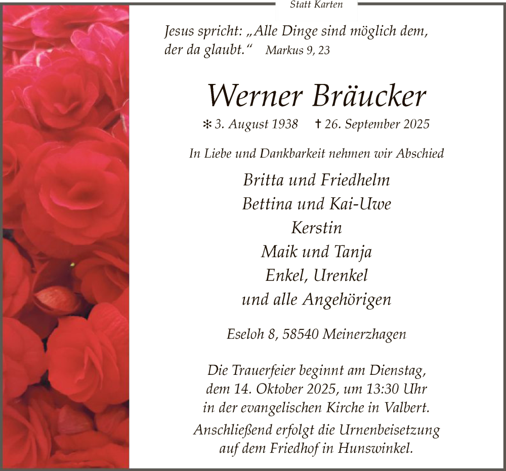Hier finden Sie alle Traueranzeigen aus der Zeitung, die bisher für Werner Bräucker erschienen sind. Weitere Traueranzeigen, die in der Zeitung erscheinen, werden hier ebenfalls aufgelistet