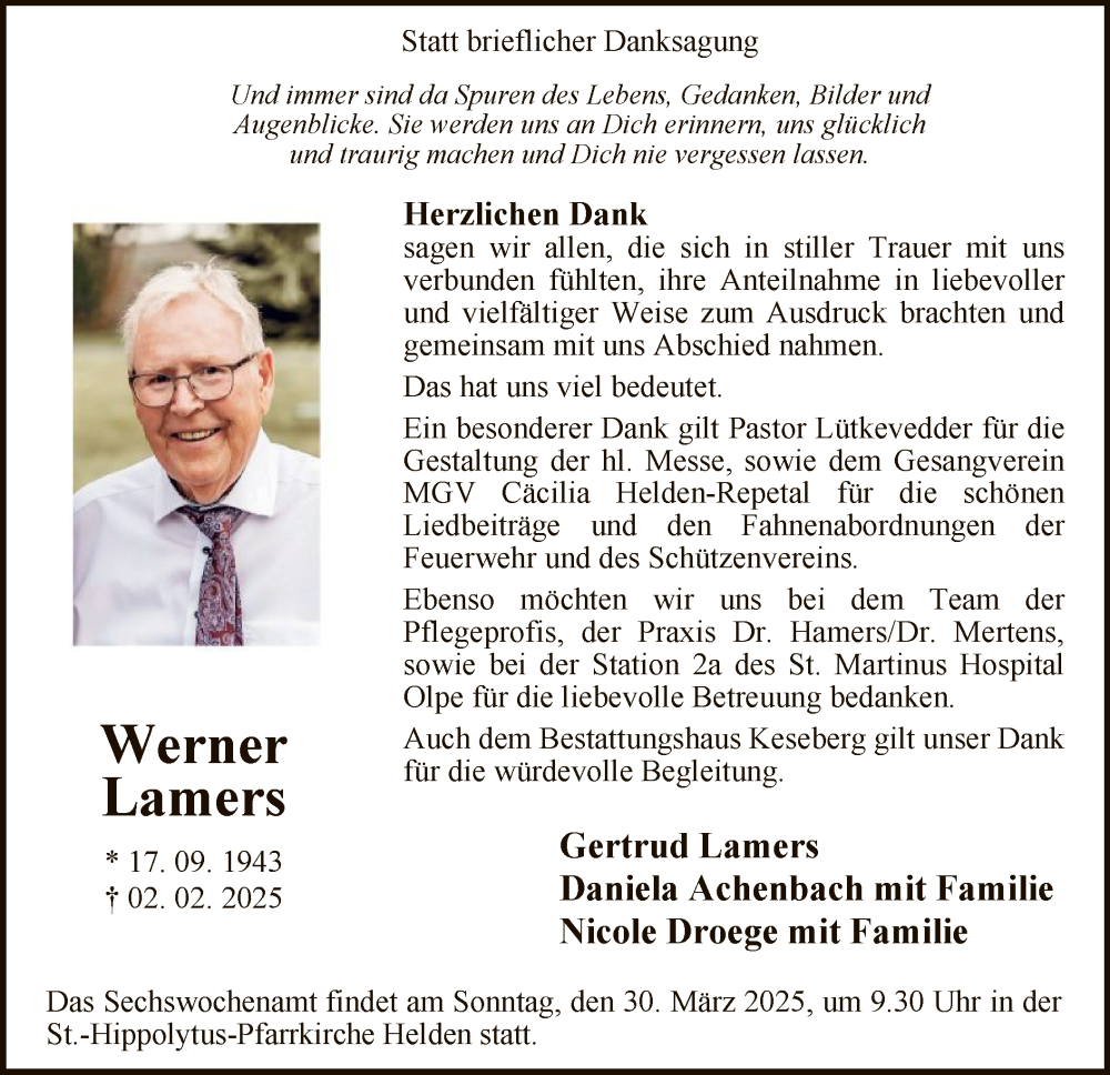 Hier finden Sie alle Traueranzeigen aus der Zeitung, die bisher für Werner Lamers erschienen sind. Weitere Traueranzeigen, die in der Zeitung erscheinen, werden hier ebenfalls aufgelistet