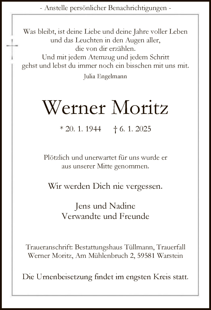 Hier finden Sie alle Traueranzeigen aus der Zeitung, die bisher für Werner Moritz erschienen sind. Weitere Traueranzeigen, die in der Zeitung erscheinen, werden hier ebenfalls aufgelistet