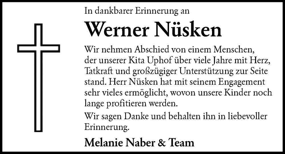 Hier finden Sie alle Traueranzeigen aus der Zeitung, die bisher für Werner Nüsken erschienen sind. Weitere Traueranzeigen, die in der Zeitung erscheinen, werden hier ebenfalls aufgelistet