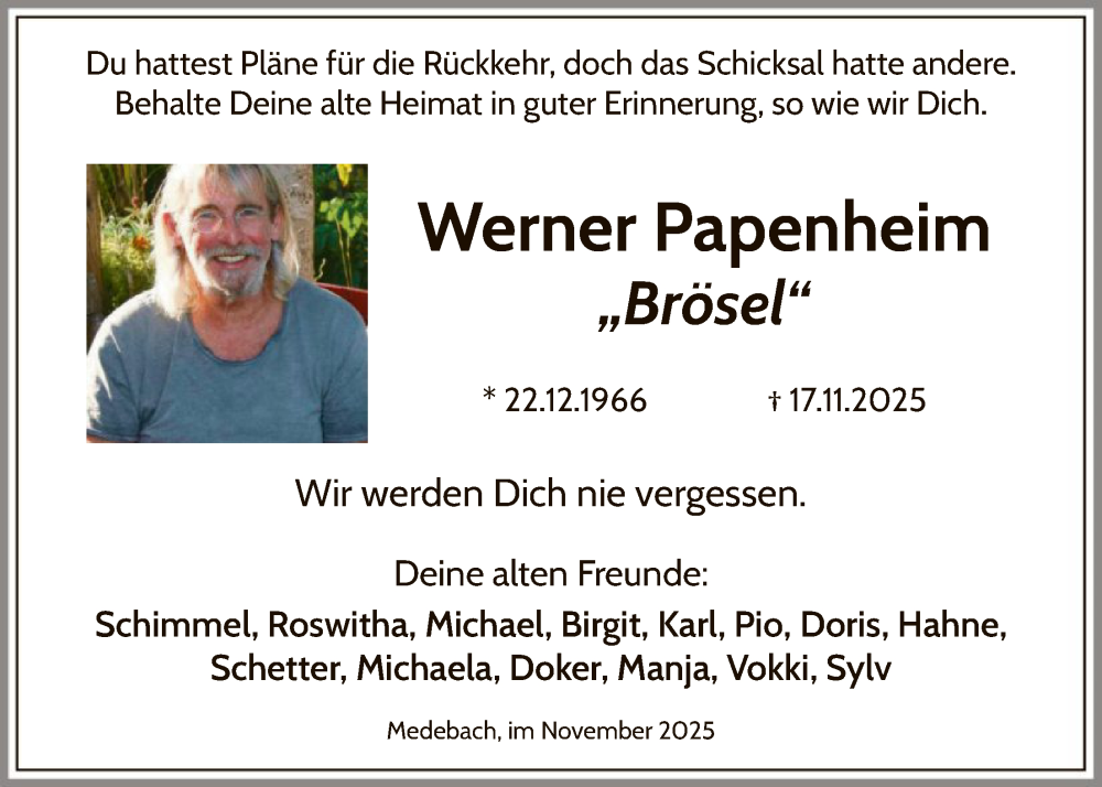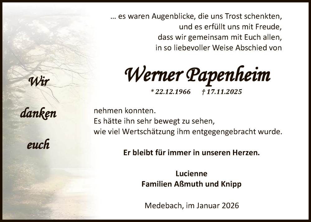 Hier finden Sie alle Traueranzeigen aus der Zeitung, die bisher für Werner Papenheim erschienen sind. Weitere Traueranzeigen, die in der Zeitung erscheinen, werden hier ebenfalls aufgelistet