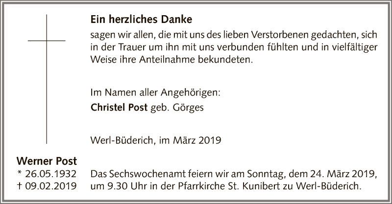 Hier finden Sie alle Traueranzeigen aus der Zeitung, die bisher für Werner Post erschienen sind. Weitere Traueranzeigen, die in der Zeitung erscheinen, werden hier ebenfalls aufgelistet