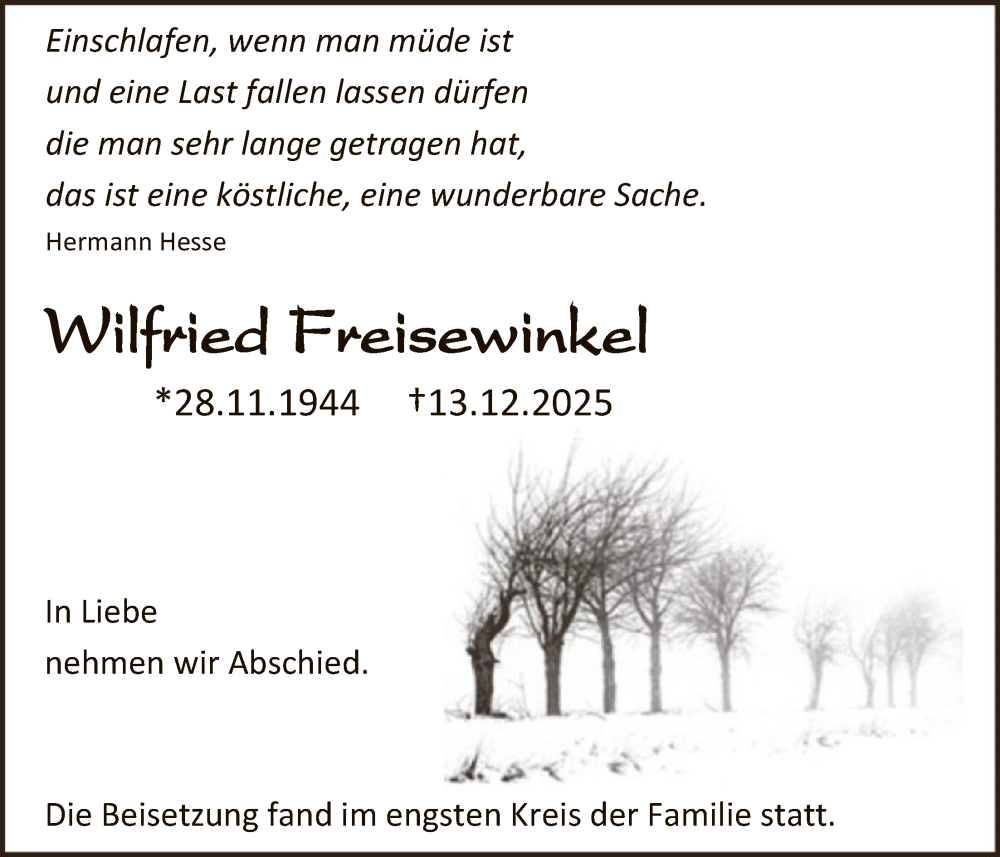 Hier finden Sie alle Traueranzeigen aus der Zeitung, die bisher für Wilfried Freisewinkel erschienen sind. Weitere Traueranzeigen, die in der Zeitung erscheinen, werden hier ebenfalls aufgelistet