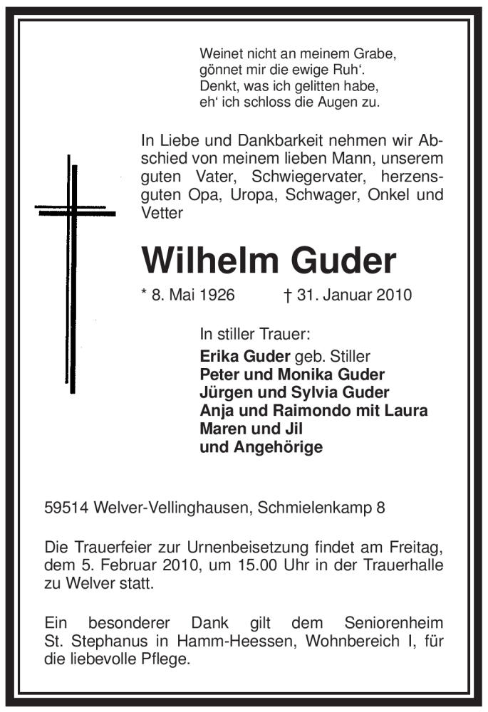 Hier finden Sie alle Traueranzeigen aus der Zeitung, die bisher für Wilhelm Guder erschienen sind. Weitere Traueranzeigen, die in der Zeitung erscheinen, werden hier ebenfalls aufgelistet