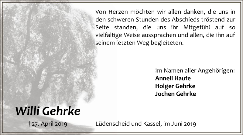 Hier finden Sie alle Traueranzeigen aus der Zeitung, die bisher für Willi Gehrke erschienen sind. Weitere Traueranzeigen, die in der Zeitung erscheinen, werden hier ebenfalls aufgelistet