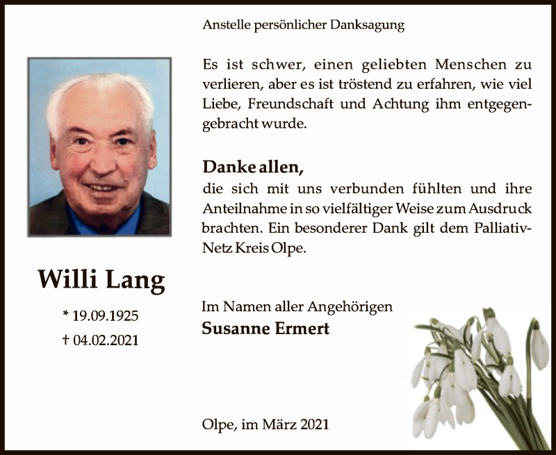 Hier finden Sie alle Traueranzeigen aus der Zeitung, die bisher für Willi Lang erschienen sind. Weitere Traueranzeigen, die in der Zeitung erscheinen, werden hier ebenfalls aufgelistet