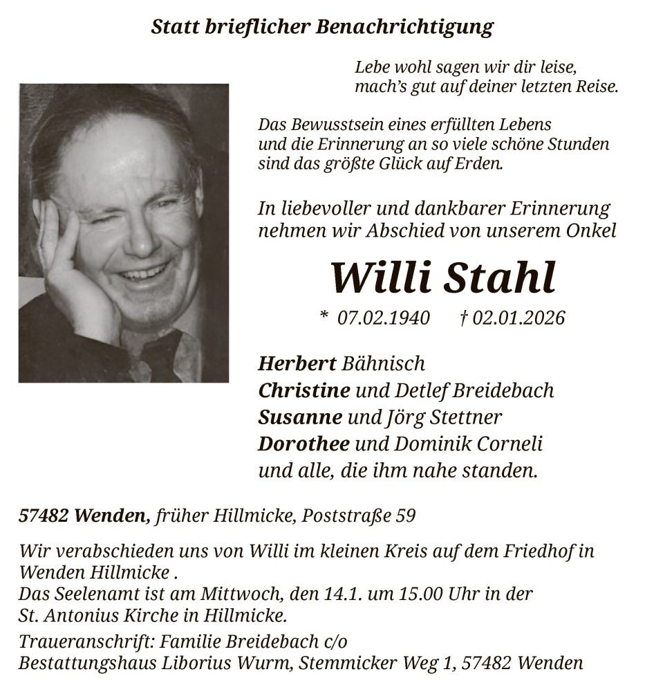 Hier finden Sie alle Traueranzeigen aus der Zeitung, die bisher für Willi Stahl erschienen sind. Weitere Traueranzeigen, die in der Zeitung erscheinen, werden hier ebenfalls aufgelistet