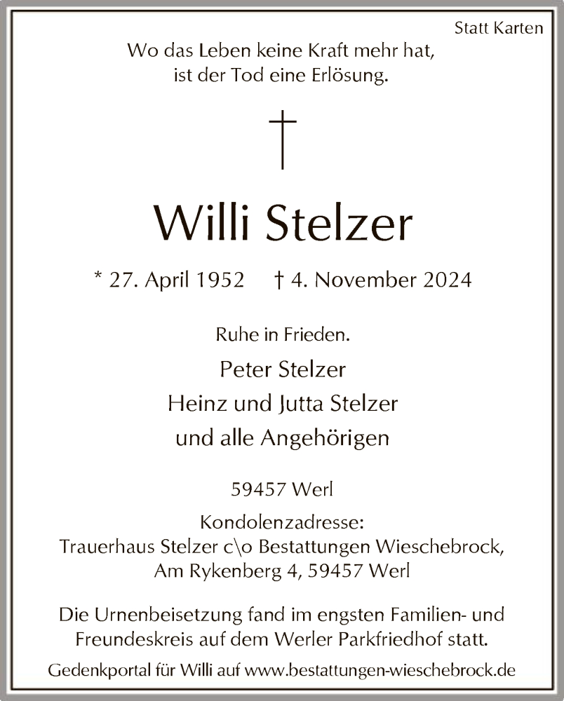 Hier finden Sie alle Traueranzeigen aus der Zeitung, die bisher für Willi Stelzer erschienen sind. Weitere Traueranzeigen, die in der Zeitung erscheinen, werden hier ebenfalls aufgelistet