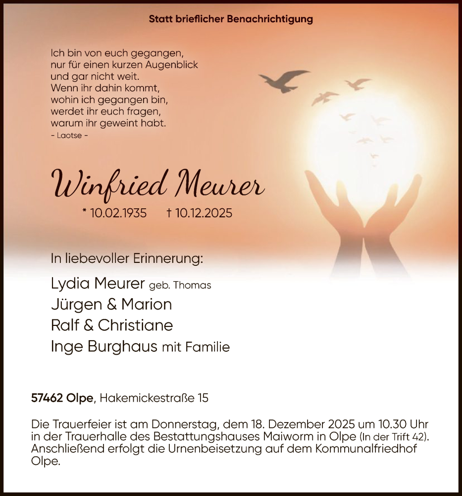 Hier finden Sie alle Traueranzeigen aus der Zeitung, die bisher für Winfried Meurer erschienen sind. Weitere Traueranzeigen, die in der Zeitung erscheinen, werden hier ebenfalls aufgelistet