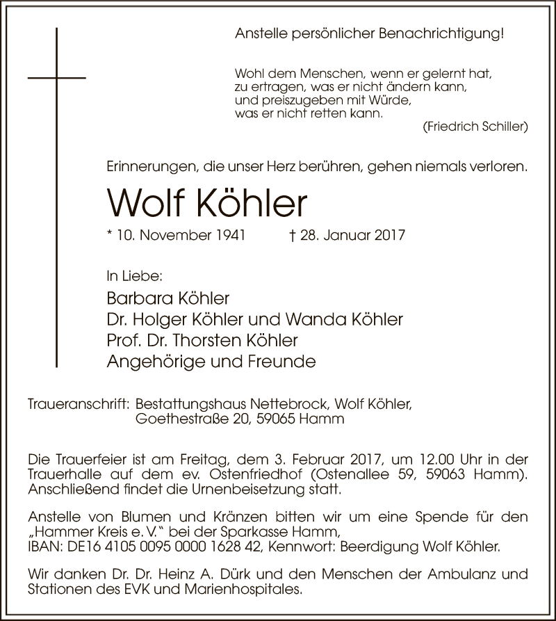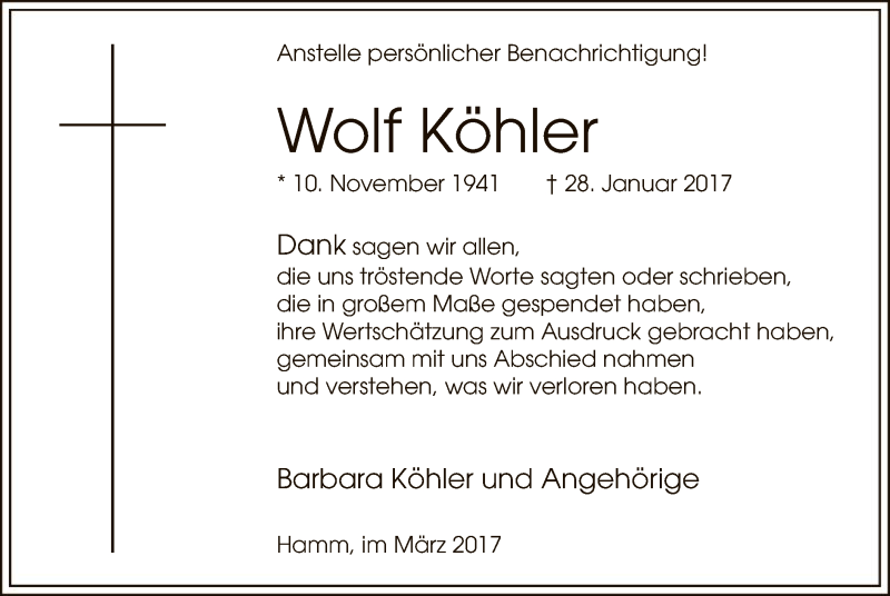 Hier finden Sie alle Traueranzeigen aus der Zeitung, die bisher für Wolf Köhler erschienen sind. Weitere Traueranzeigen, die in der Zeitung erscheinen, werden hier ebenfalls aufgelistet