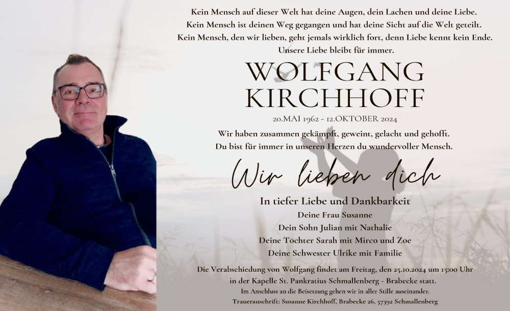 Hier finden Sie alle Traueranzeigen aus der Zeitung, die bisher für Wolfgang Kirchhoff erschienen sind. Weitere Traueranzeigen, die in der Zeitung erscheinen, werden hier ebenfalls aufgelistet