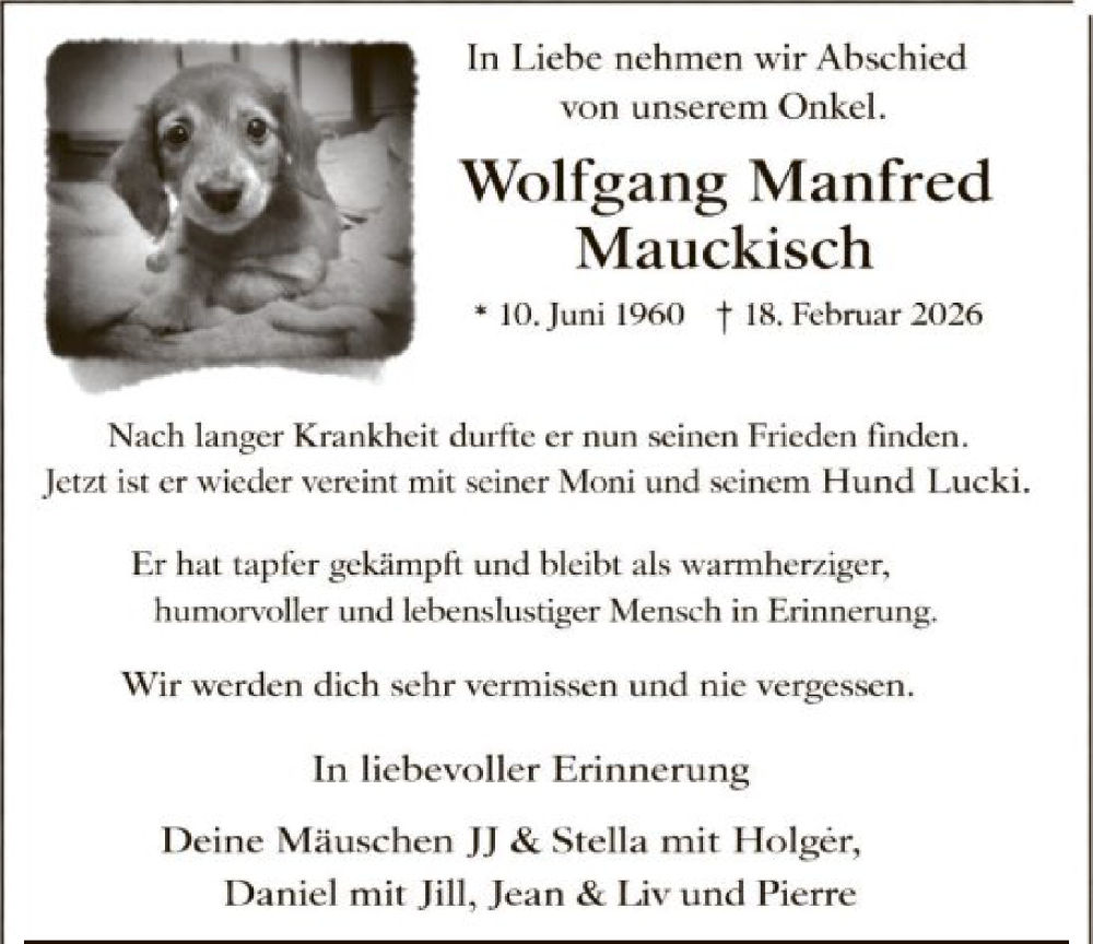 Hier finden Sie alle Traueranzeigen aus der Zeitung, die bisher für Wolfgang Manfred Mauckisch erschienen sind. Weitere Traueranzeigen, die in der Zeitung erscheinen, werden hier ebenfalls aufgelistet